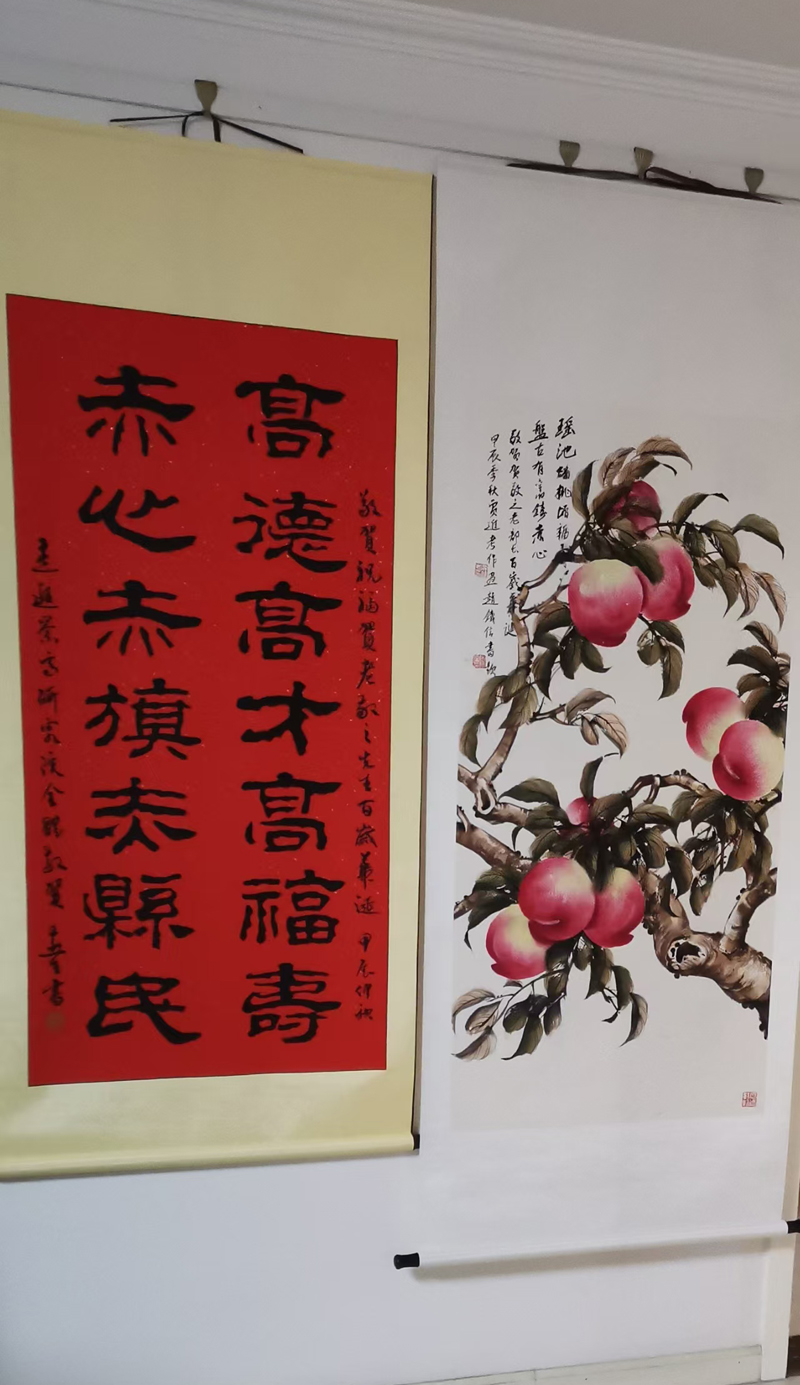 在我国著名大诗人、大作家,杰出的人民文艺家、文艺界德高望重的老领导,中国大众文化学会名誉会长贺敬之百岁华诞之际,赵铁信会长和著名画家贾进考代表学会共同创作了《寿桃图》。贾进考画九棵大寿桃,气韵生动,活灵活现,雅俗共赏。赵铁信会长书题: